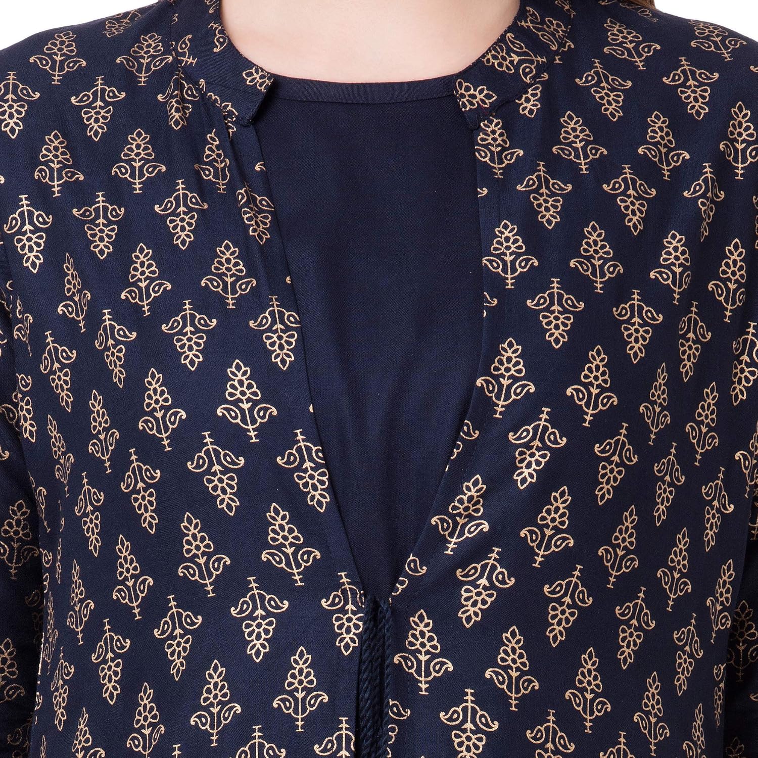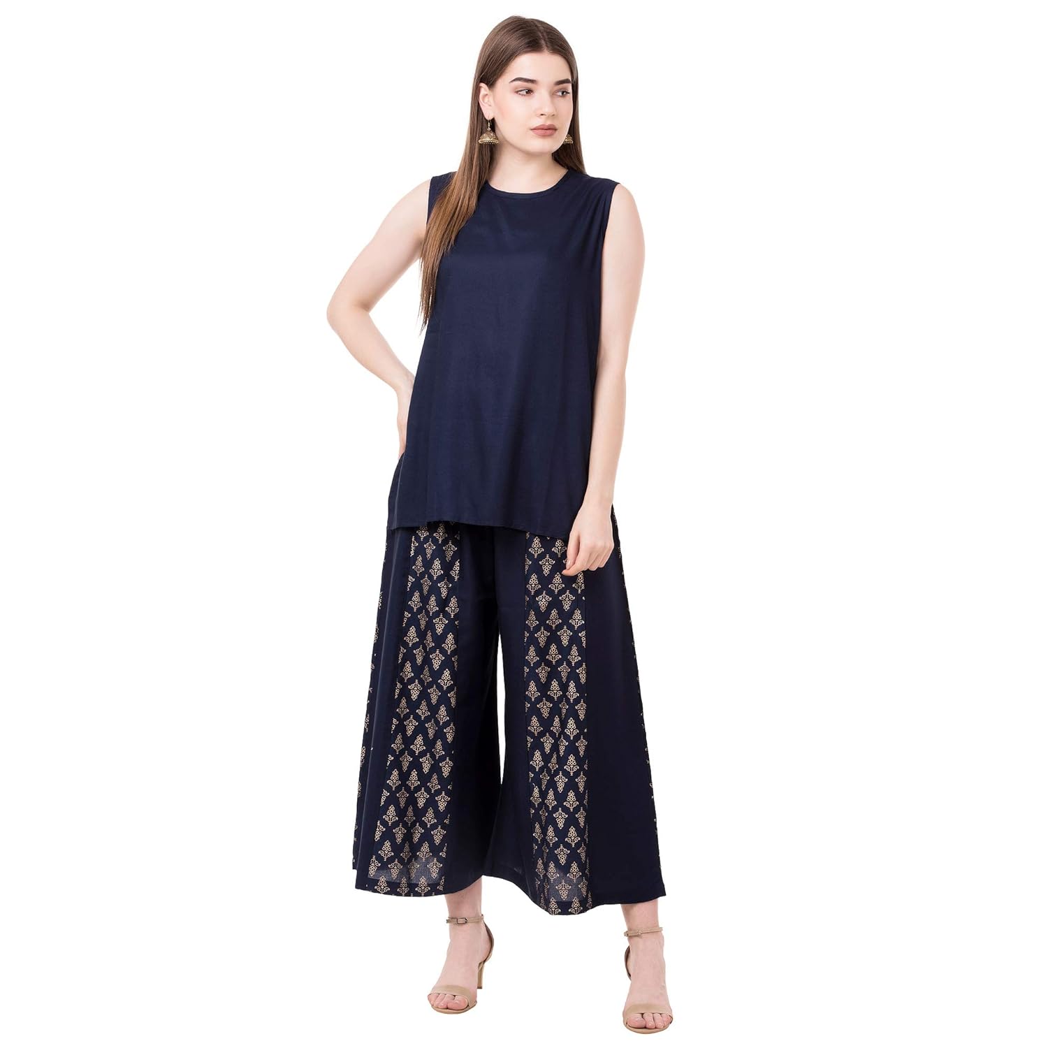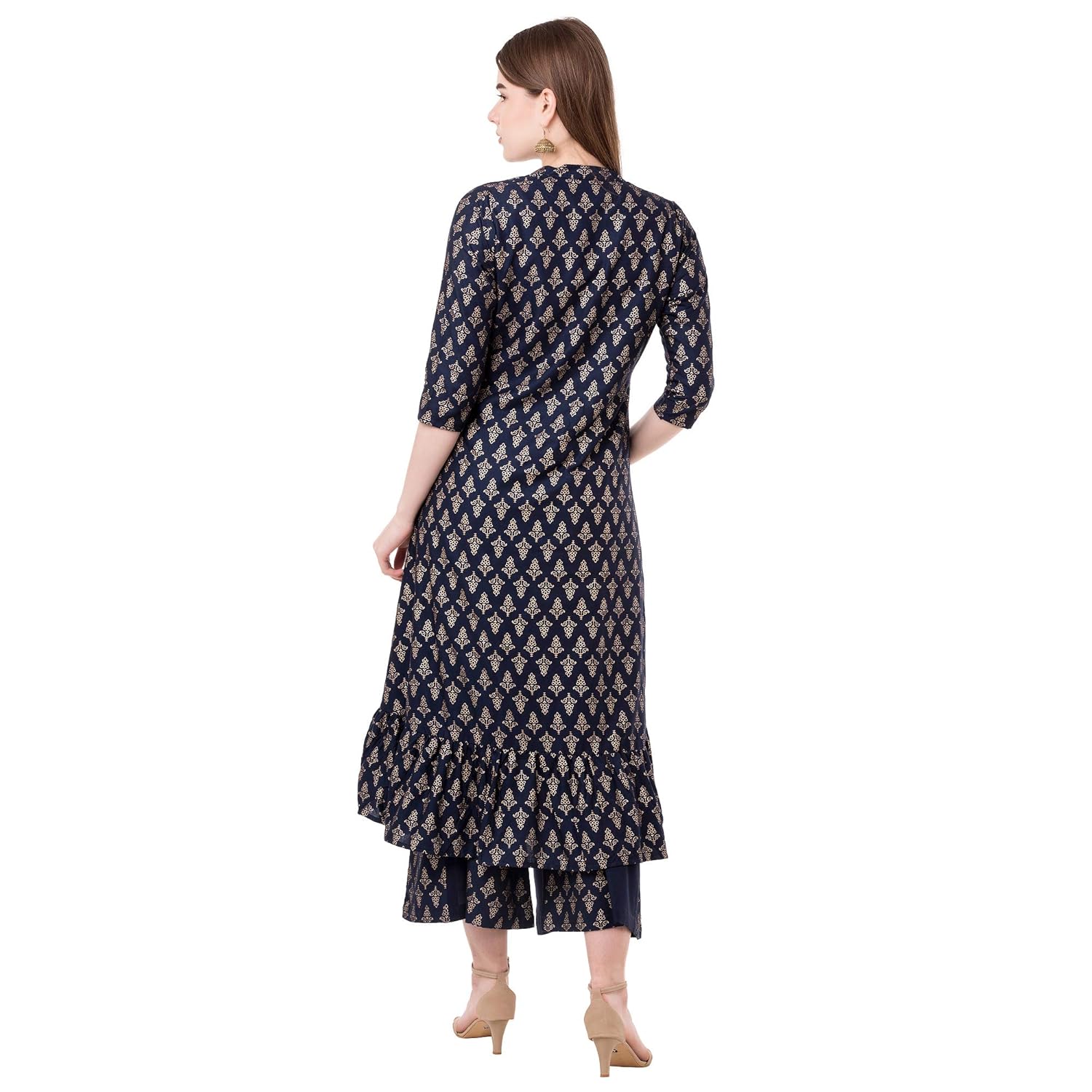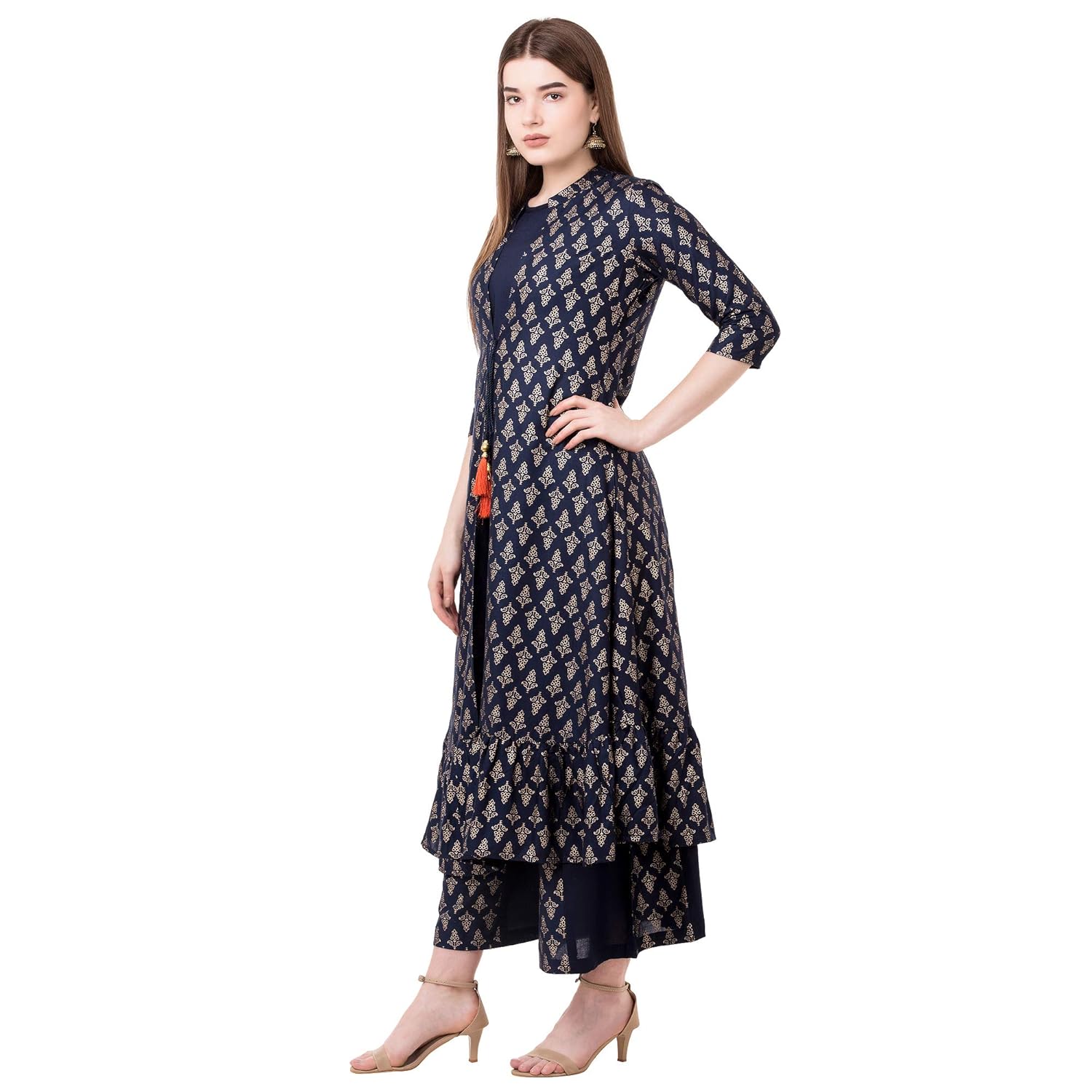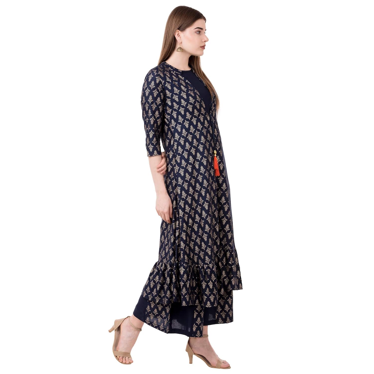 - Blue and Golden layered calf length beautiful kurta, has a round neck, three-quarter sleeves, flared hem, side slits half printed blue color Palazzos, has partially elasticated waistband, slip-on closure. Blue and Golden flared Kurta has tie-up detail.